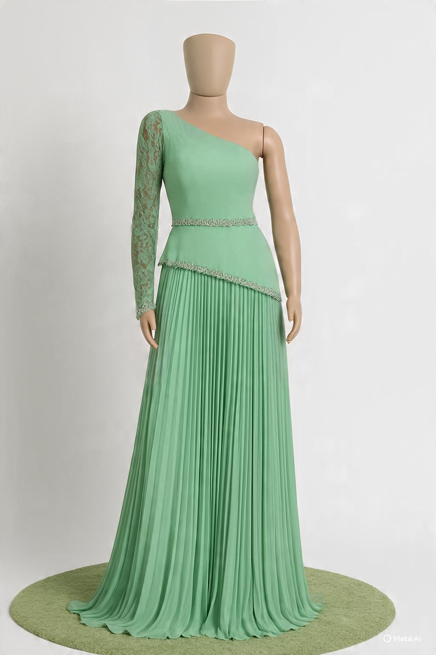 القصة (العلوي): يتميز بقصة كتف واحدة أنيقة (One-Shoulder)، حيث يأتي الكم الطويل مزوداً بتطريز أو دانتيل شفاف لإضافة لمسة رومانسية ناعمة.